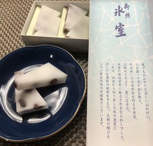 鶴屋吉信『御所氷室』が入りましたので、6月、7月のおやつに週1回程度、用意させて頂きます。